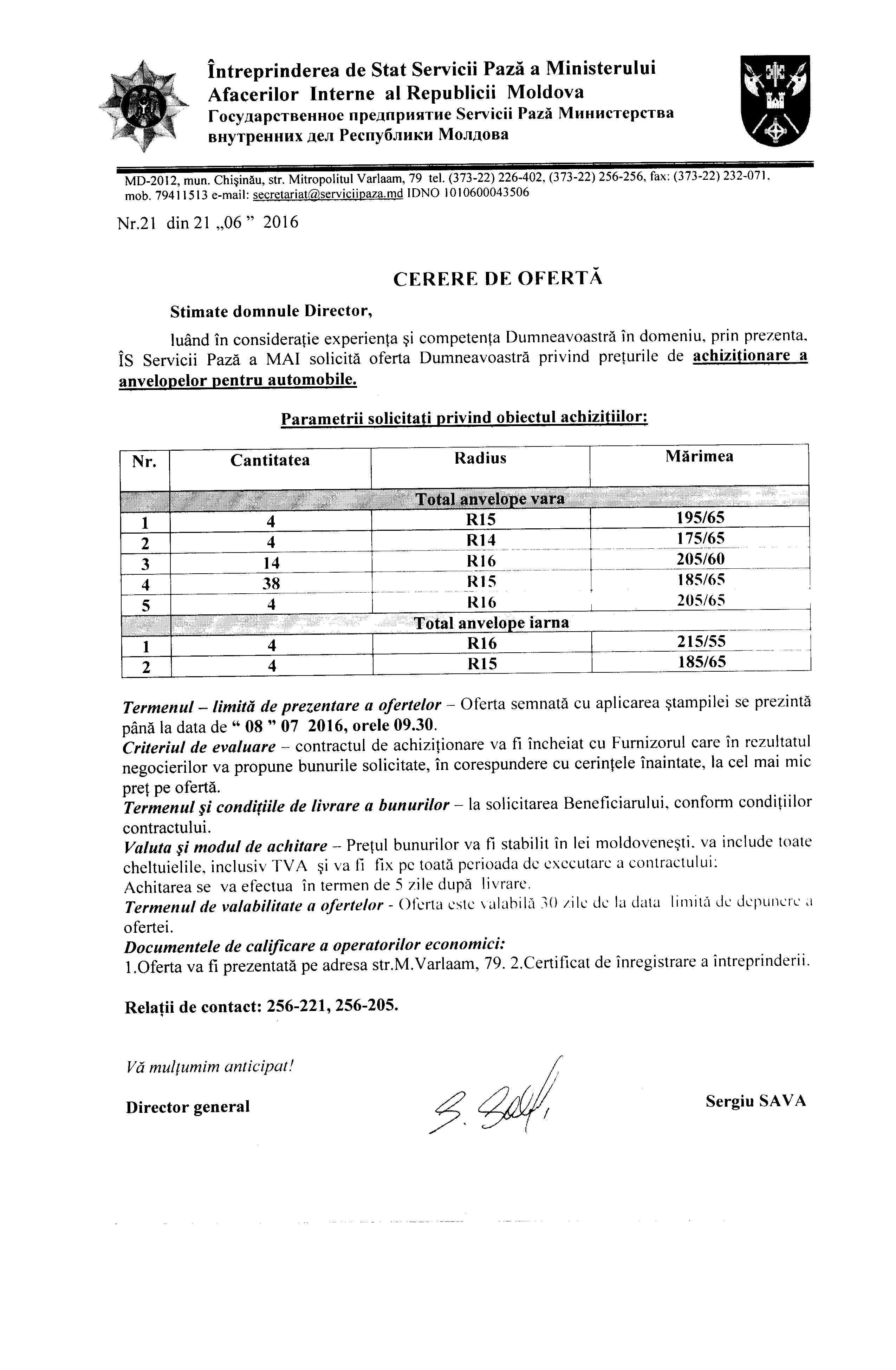ÎS Servicii Pază a MAI anunță cererea de ofertă pentru achiziţionarea a anvelopelor pentru automobile.