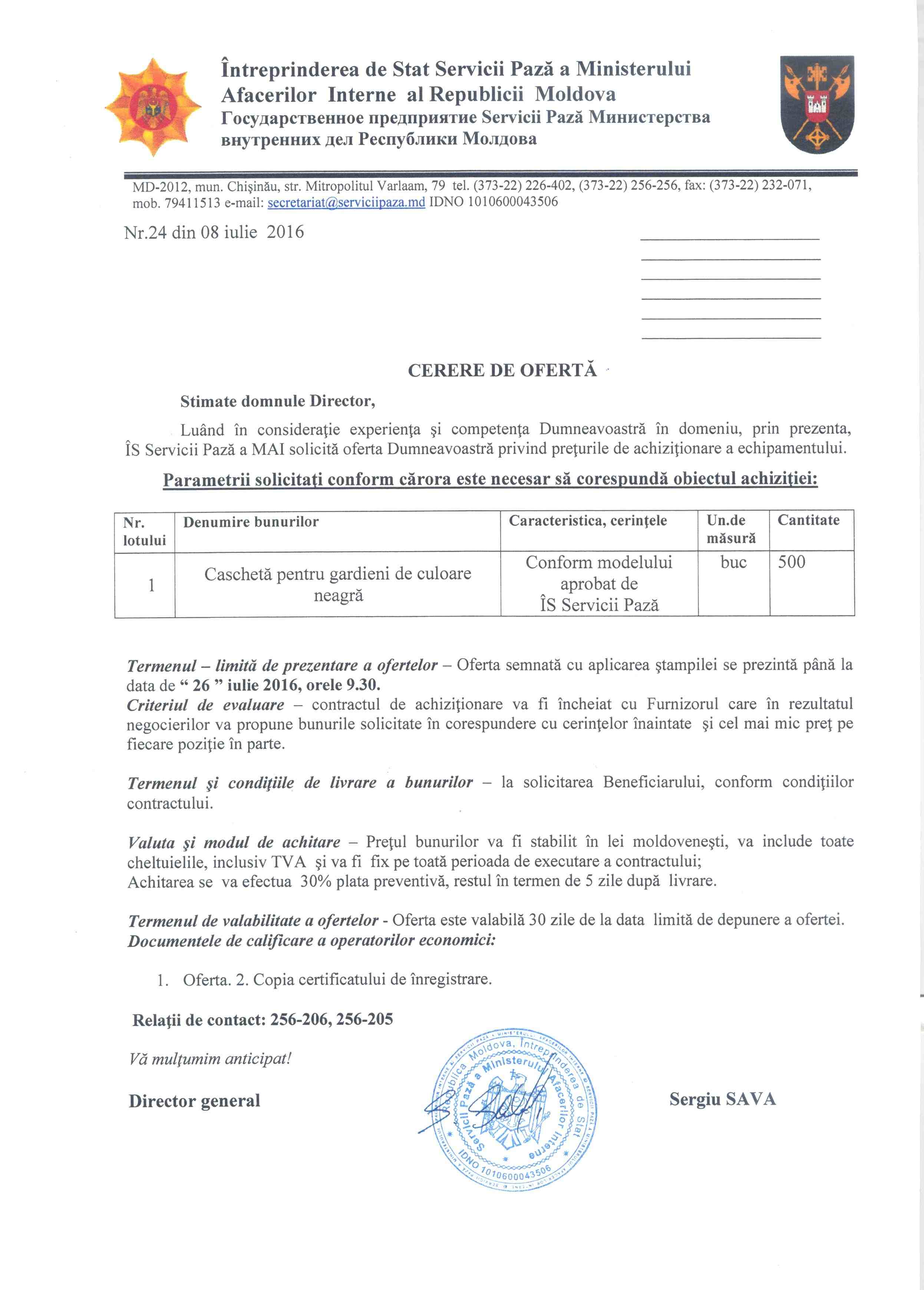 ÎS Servicii Pază a MAI anunță cererea de ofertă pentru achiziţionarea a echipamentului (caschetă).