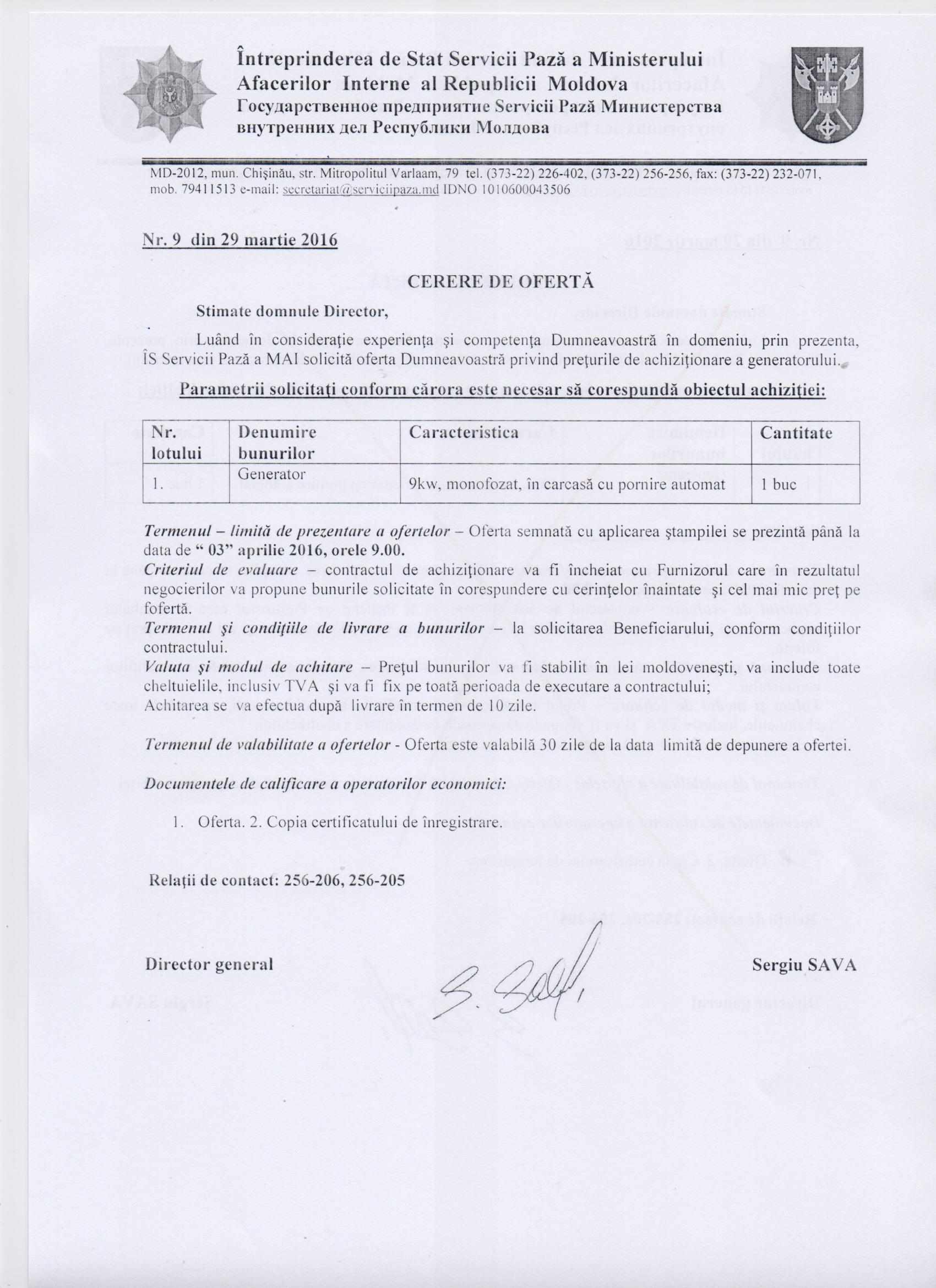 ÎS Servicii Pază a MAI anunță cererea de ofertă pentru achiziționarea generatorului de electricitate.