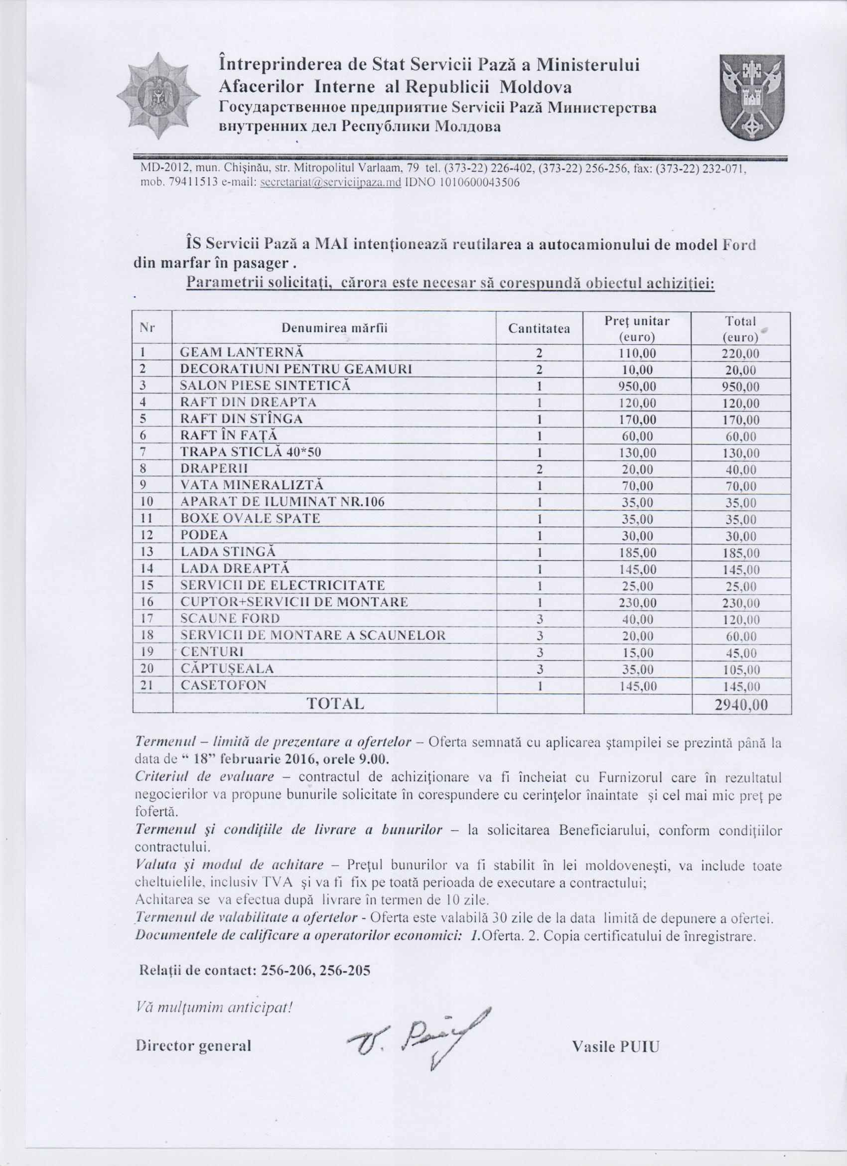 ÎS Servicii Pază a MAI anunță cererea de ofertă pentru reutilarea autocamionului Ford din categoria marfar în categoria de transport a pasagerilor.