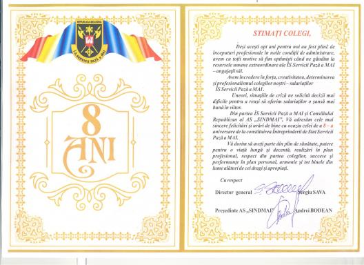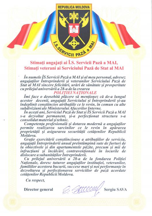 Felicitare, cu prilejul aniversării a 68-a de la fondarea Servicii Pază a MAI