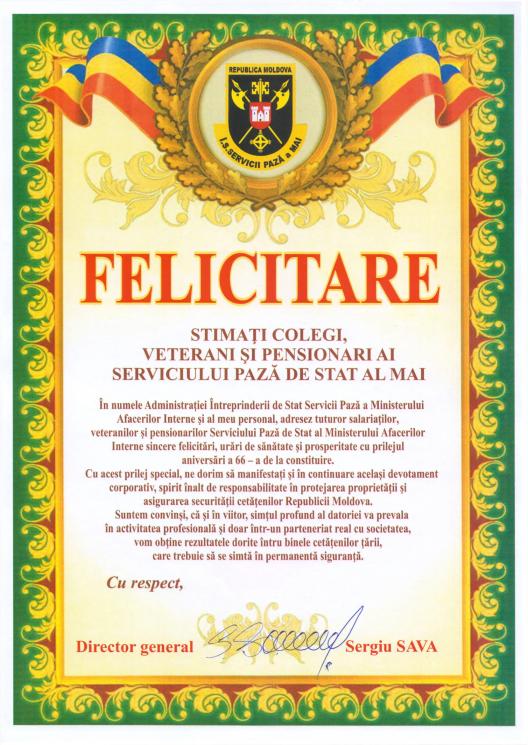 Felicitare, cu prilejul aniversării a 67-a de la fondarea Servicii Pază a MAI
