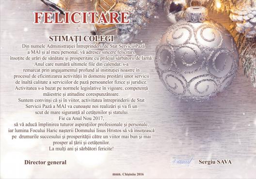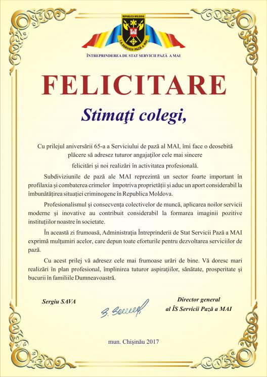 Felicitare, cu prilejul aniversării a VI-a de la fondarea Întreprinderii de Stat Servicii Pază a MAI