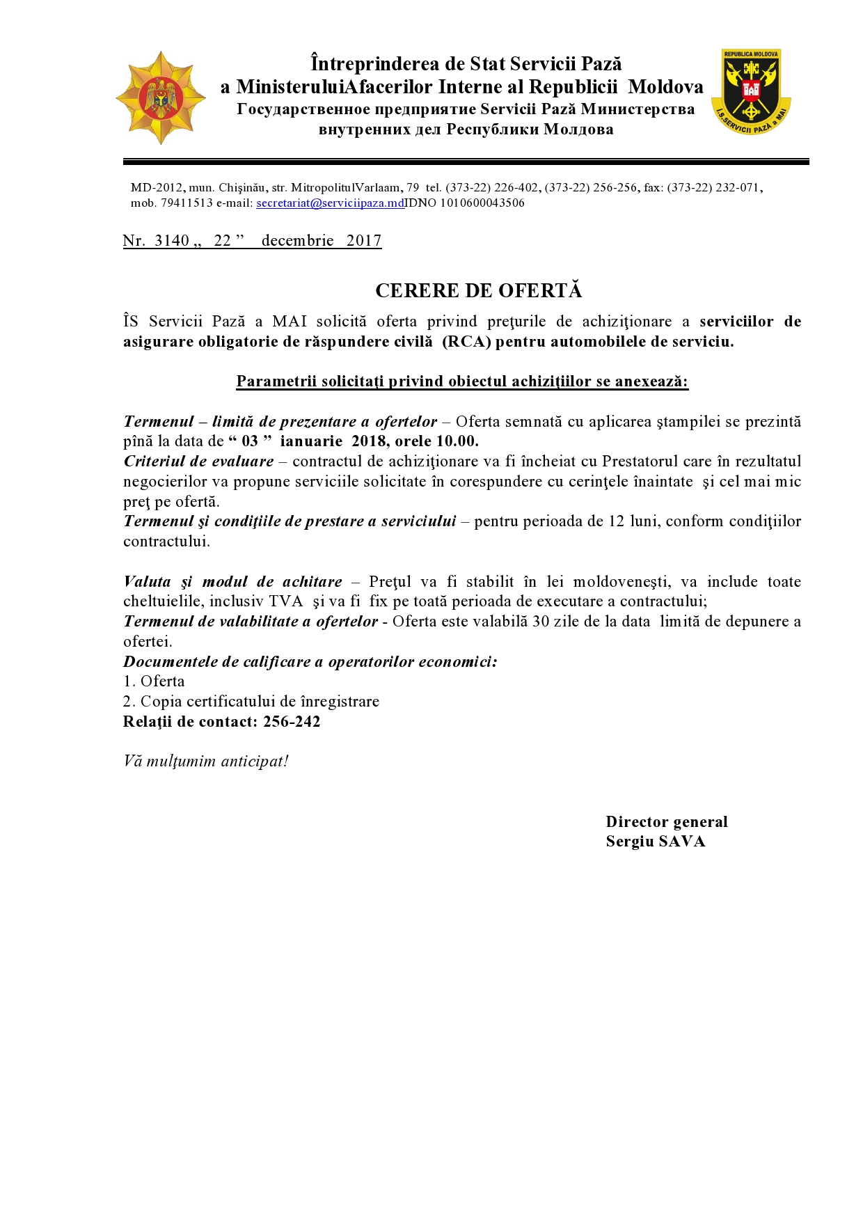 Cerere de oferta privind preţurile de achiziţionare a serviciilor de asigurare obligatorie de răspundere civilă (RCA) pentru automobilele de serviciu