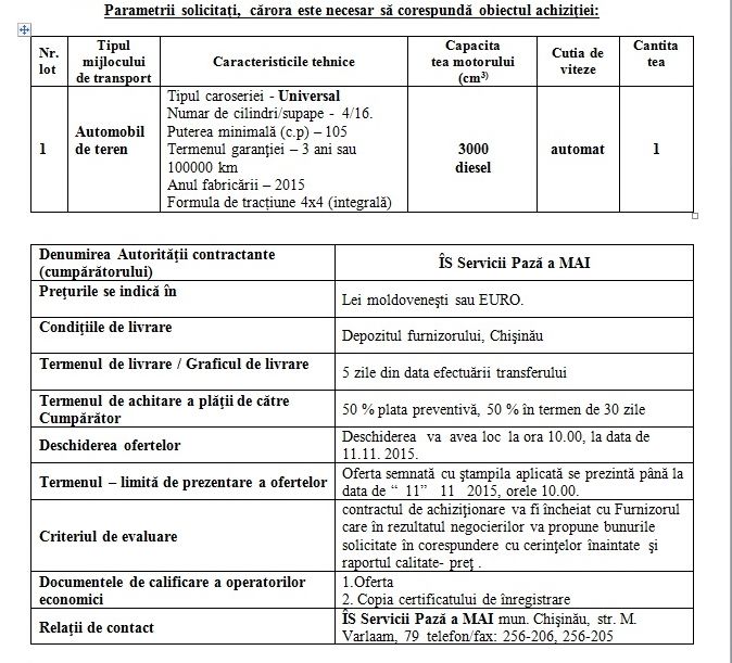 ÎS Servicii Paza a MAI invită operatorii economici interesaţi să participe la procedura privind achiziţionarea mijloacelor de transport. Este necesară procurarea unui autoturism de tip universal. Parametrii necesari și numerele de contact le găsiți afișate în document.