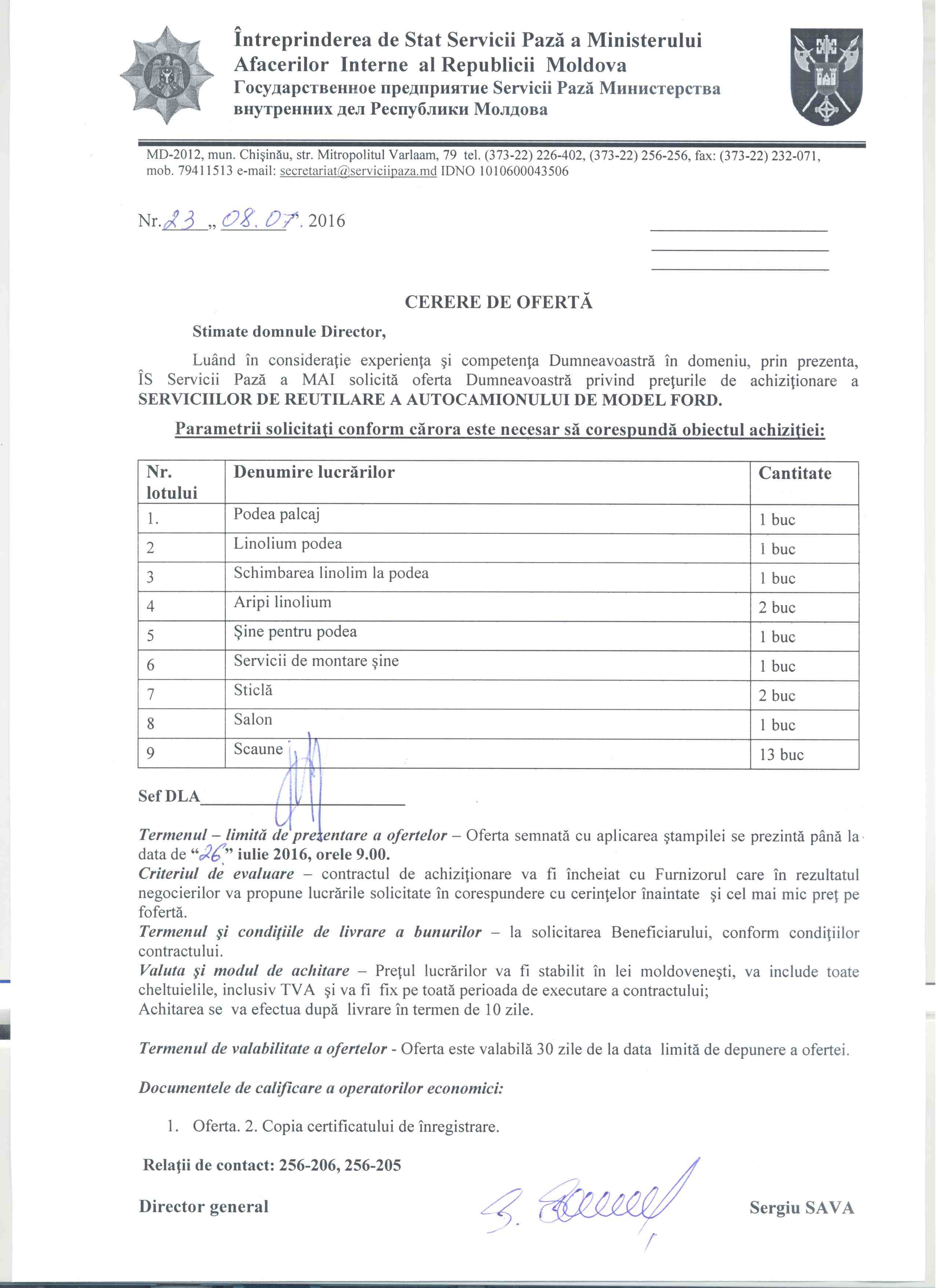 ÎS Servicii Pază a MAI anunță cererea de ofertă pentru achiziţionare a serviciilor de reutilizare a autocamionului de model Ford.