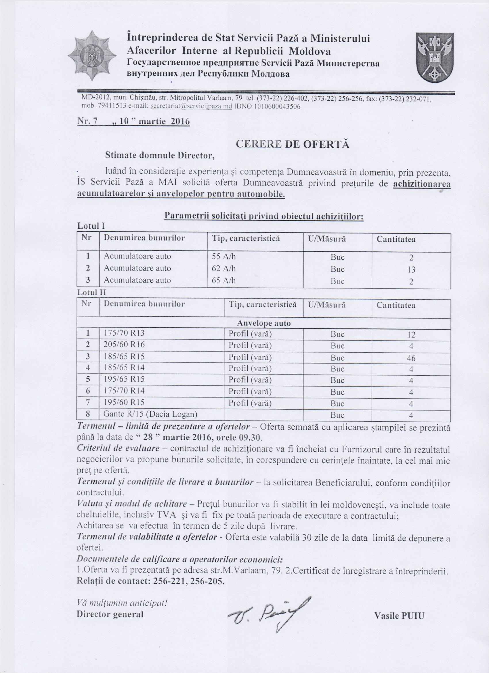 ÎS Servicii Pază a MAI anunță cererea de ofertă pentru achiziționarea acumulatoarelor şi anvelopelor pentru automobile.