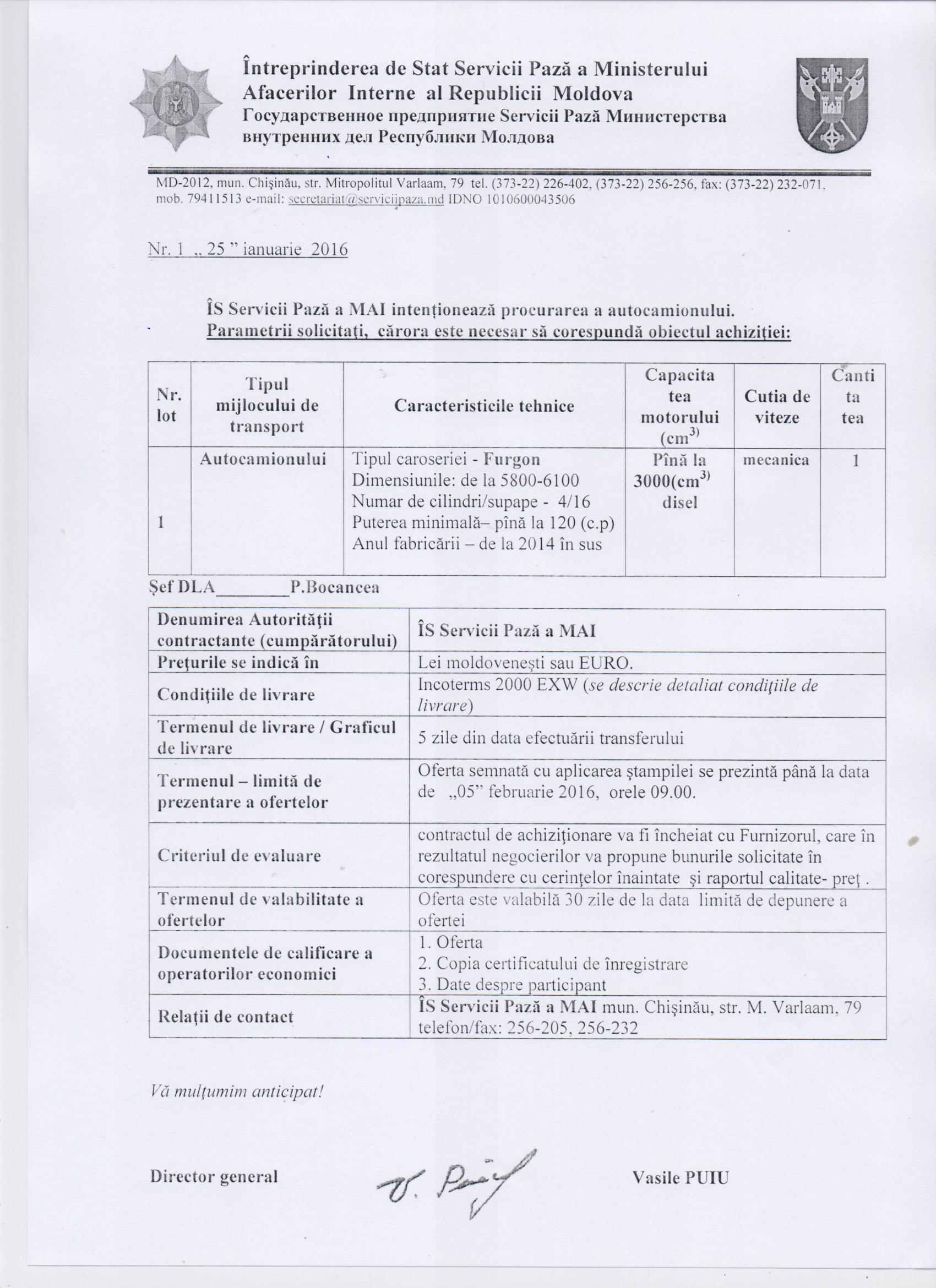 ÎS Servicii Pază a MAI anunță cererea de ofertă pentru achiziționarea autocamionului.