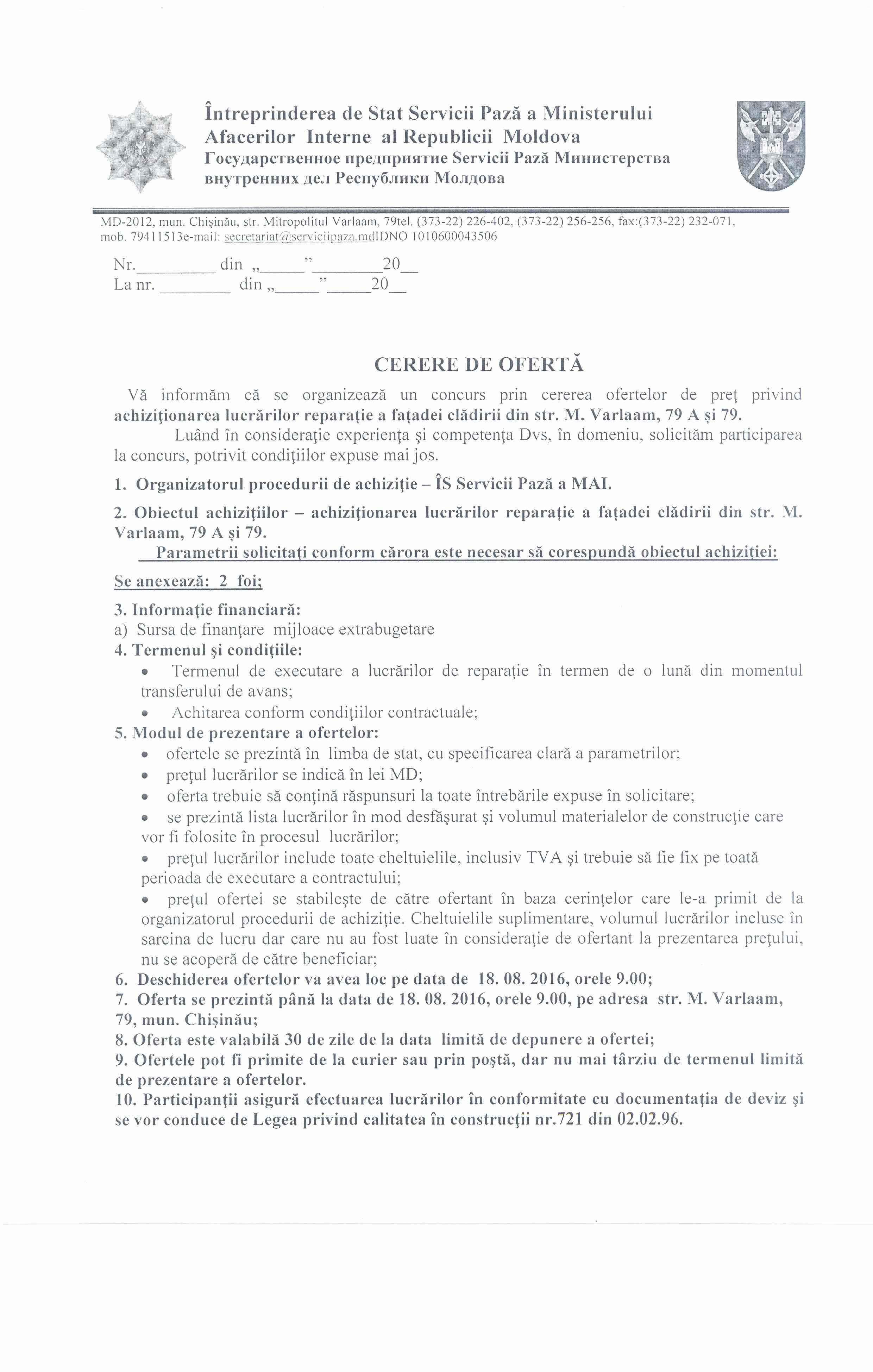 ÎS Servicii Pază a MAI anunță cererea de ofertă pentru achiziţionarea lucrarilor reparatie a fatadei cladirei.