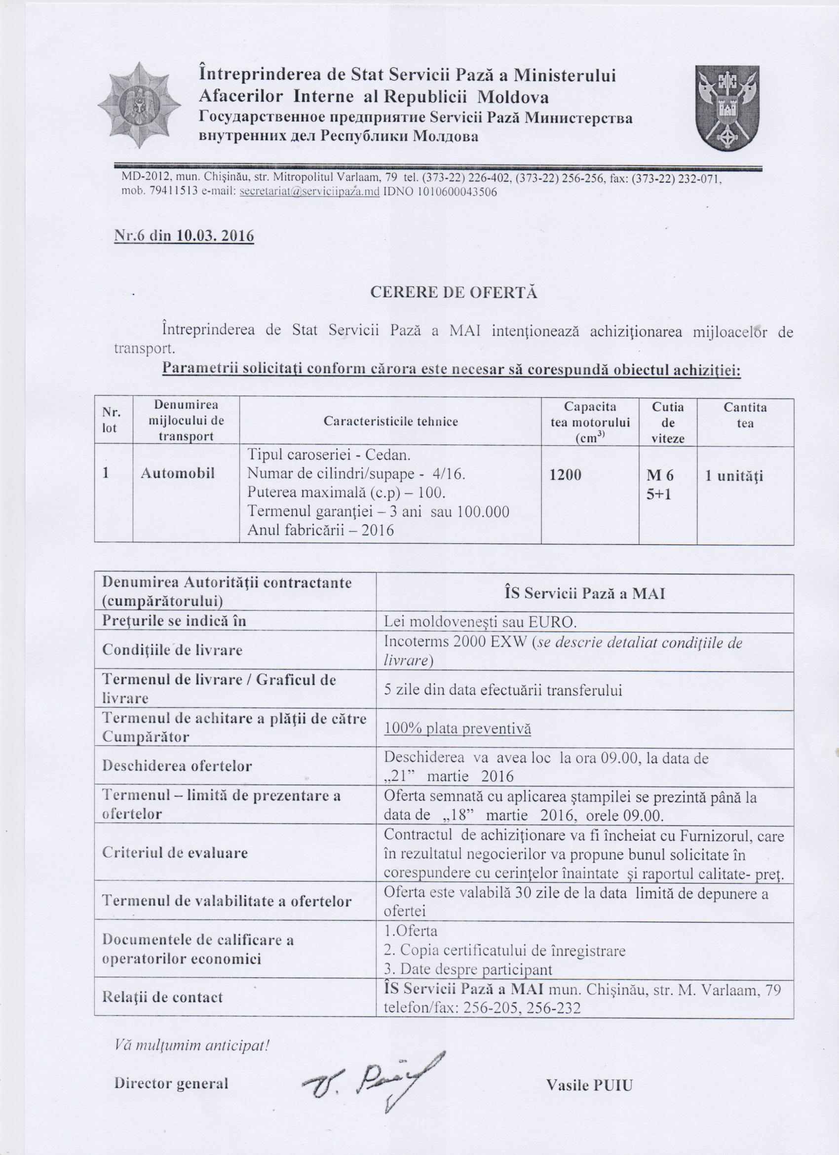 ÎS Servicii Pază a MAI anunță cererea de ofertă pentru achiziționarea mijloacelor de transport.