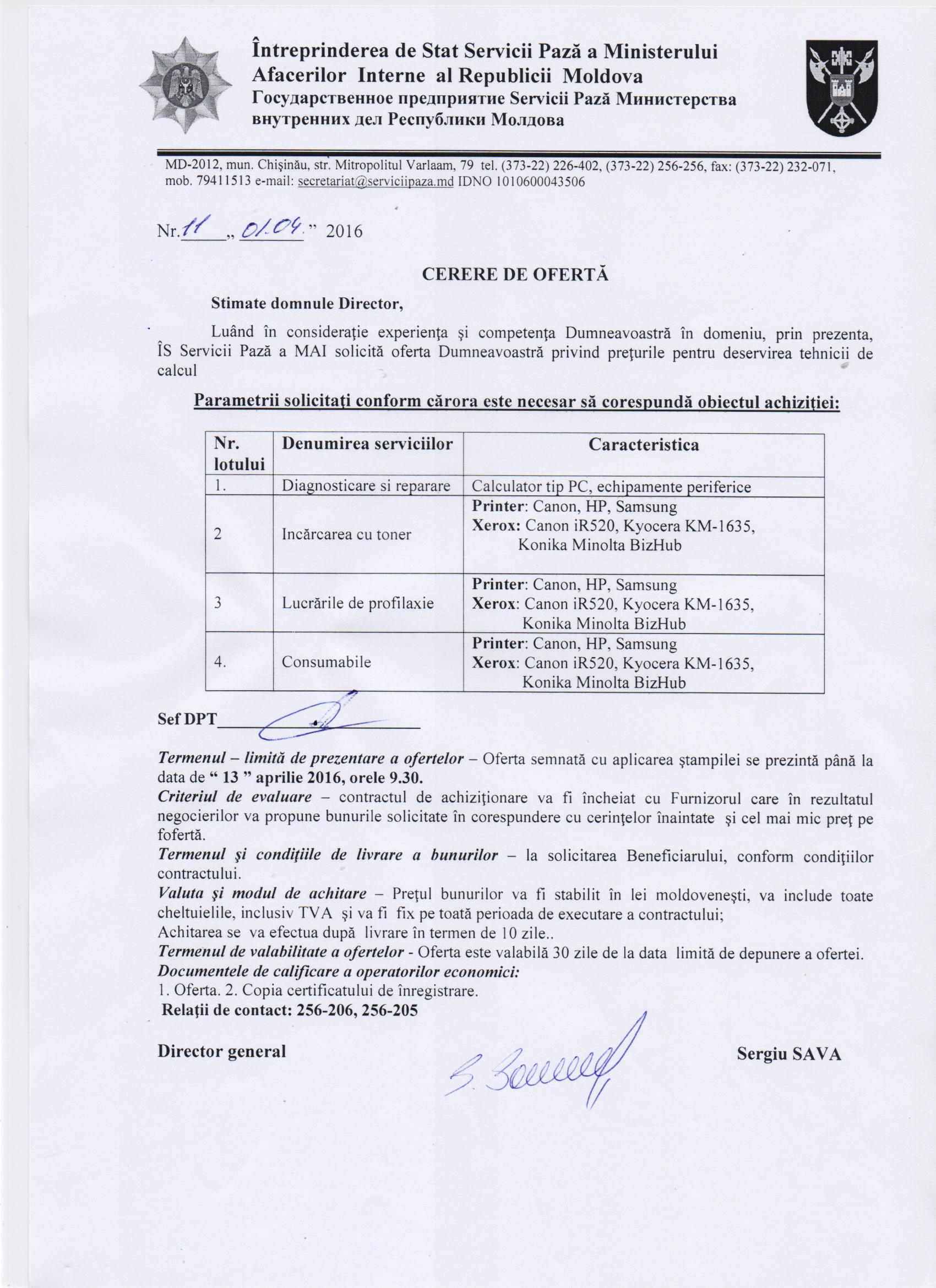 ÎS Servicii Pază a MAI anunță cererea de ofertă pentru deservirea tehnicei de calcul.