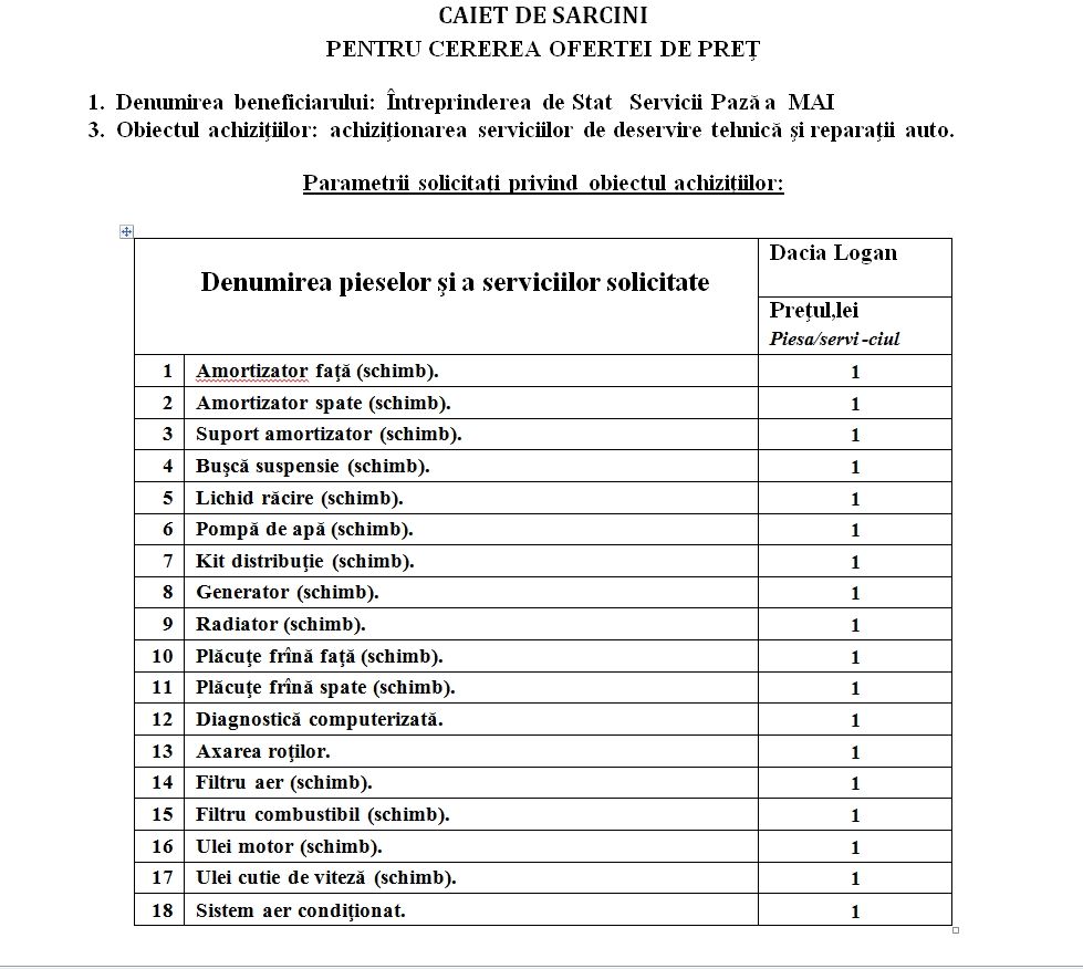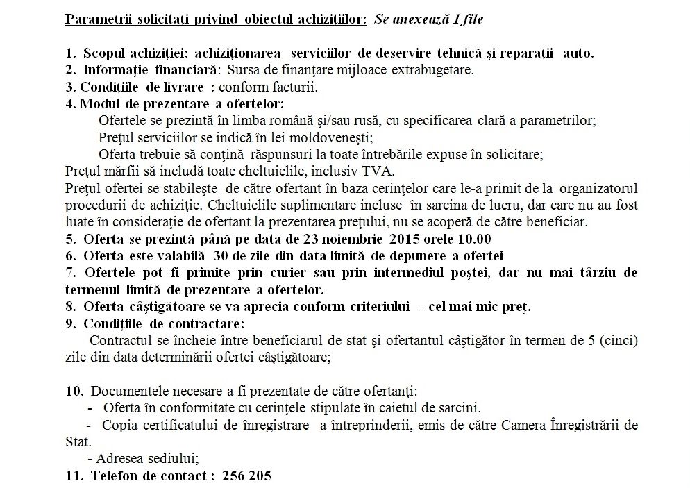 Cererea de ofertă pentru achiziţionarea serviciilor de deservire tehnică şi reparaţii auto
