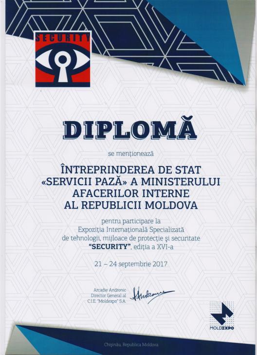Întreprinderea de Stat Servicii Pază a participat la Expozitia Internațională ,,Security”, ediția a XVI-a, care are drept scop prezentarea celor mai recente progrese tehnologice în materie de securitate.  Evenimentul sa desfășurat în perioada 21 - 24 septembrie 2017, în incinta Centrului Expoziţional „Moldexpo”, sub egida Ministerului Afacerilor Interne.