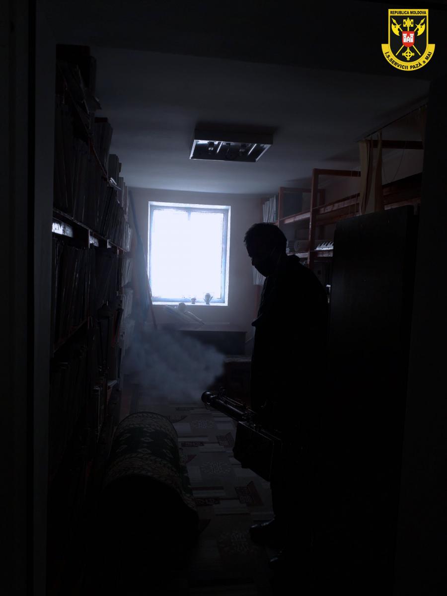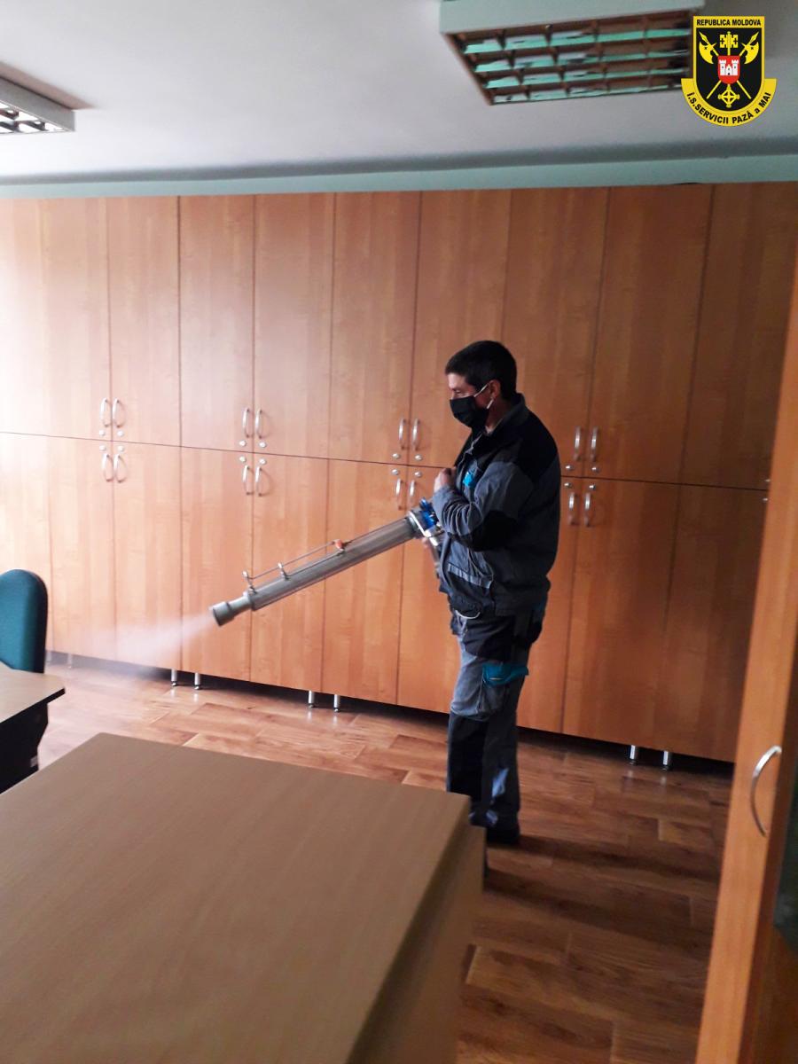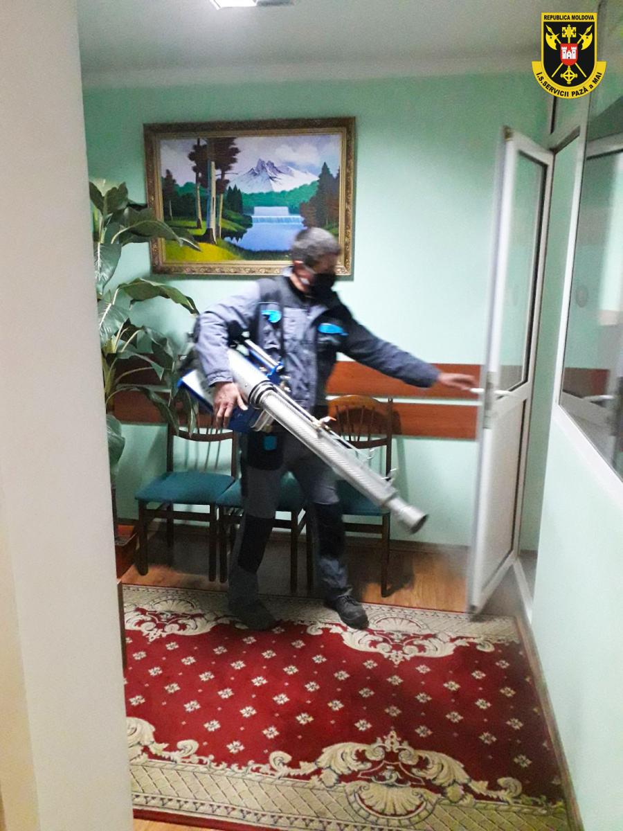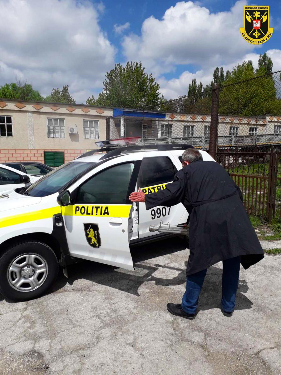 De asemenea, încăperile și edificiile subdiviziunilor situate în mun. Chișinău, automobilele de serviciu și echipele grupelor operative, sunt sistematic supuse prelucrării cu dispozitivul de dispersare forțată a dezinfectanților. În mod de cooperare prin conjugarea eforturilor comune în combaterea pandemiei, au fost supuse prelucrării de dezinfectare prin dispersarea forțată și o serie de autoturisme din dotarea Inspectoratului General de Poliție.