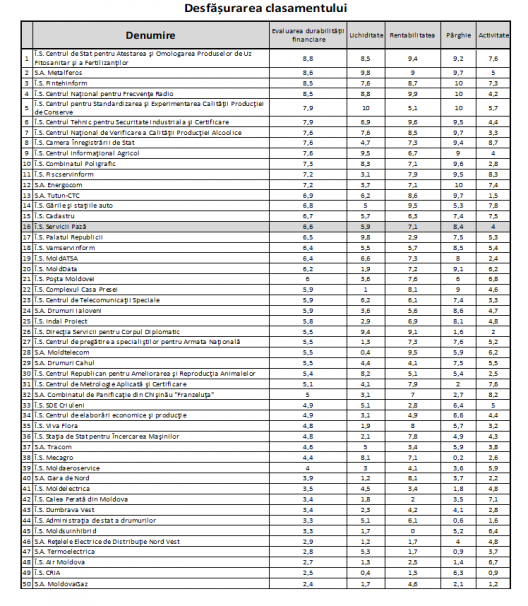 Calcularea indicatorului Sustenabilității financiare a celor 50 mai mari întreprinderi de stat din Moldova cu active și capital social mai mare de un milion de lei a fost efectuată în baza analizei situației economice pe perioada anilor 2015 și 2016. Întreprinderi de stat au fost evaluate în baza a patru criterii: lichiditatea întreprinderii; profitabilitatea; rata de îndatorare; și performanța activității.