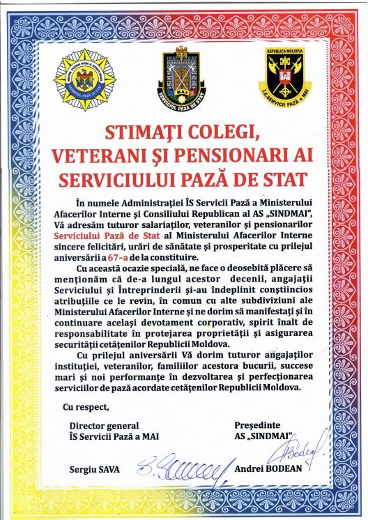 Felicitare, cu prilejul aniversării a 67-a de la fondarea Servicii Pază a MAI