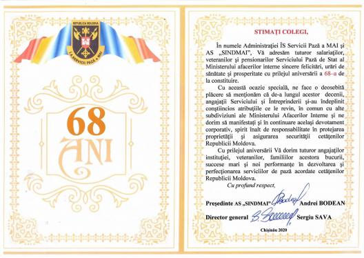 Felicitare, cu prilejul aniversării a 68-a de la fondarea Servicii Pază a MAI